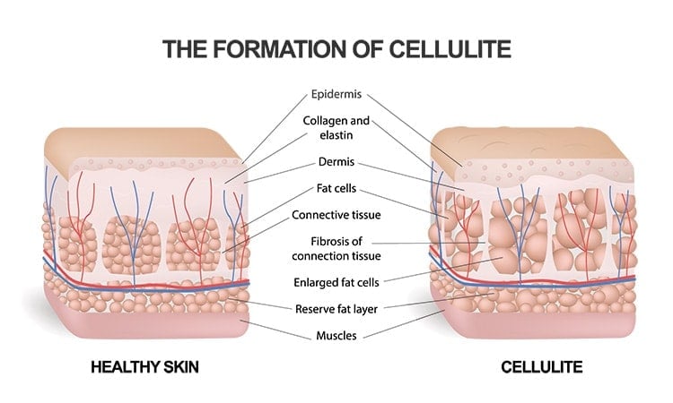 Tough bands of collagen known as septae tether the underside of the skin’s surface to the layers below. Fat cells surround and are “partitioned” by these septae, so when fat cells grow larger, they begin to crowd together and bulge out. This crowded fat pushes up against the surface of the skin—but every point where septae are connected remains fixed in place, creating a little dimple. The little dimples are even more obvious when the skin itself is thin.